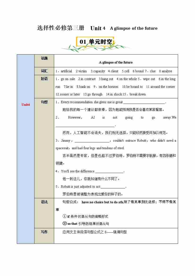 选择性必修第三册 Unit 4 A glimpse of the future(知识清单)(外研版2019)(学生版)