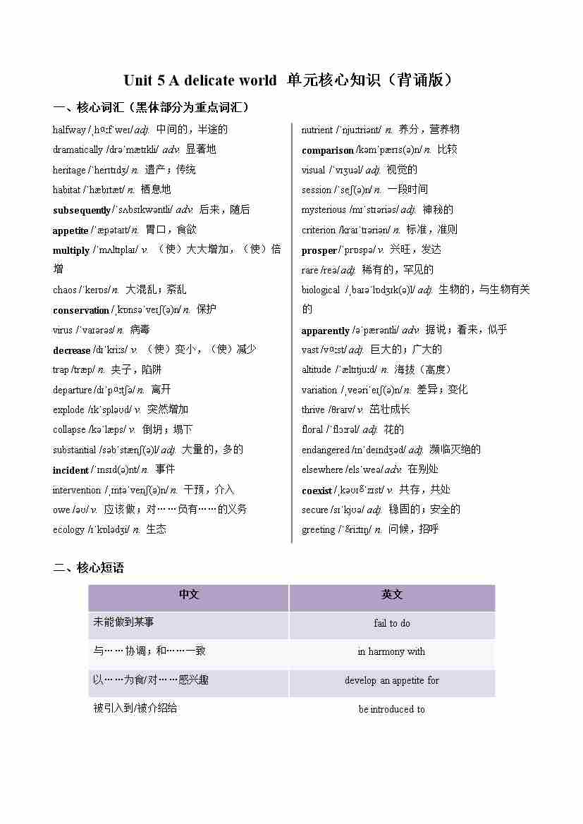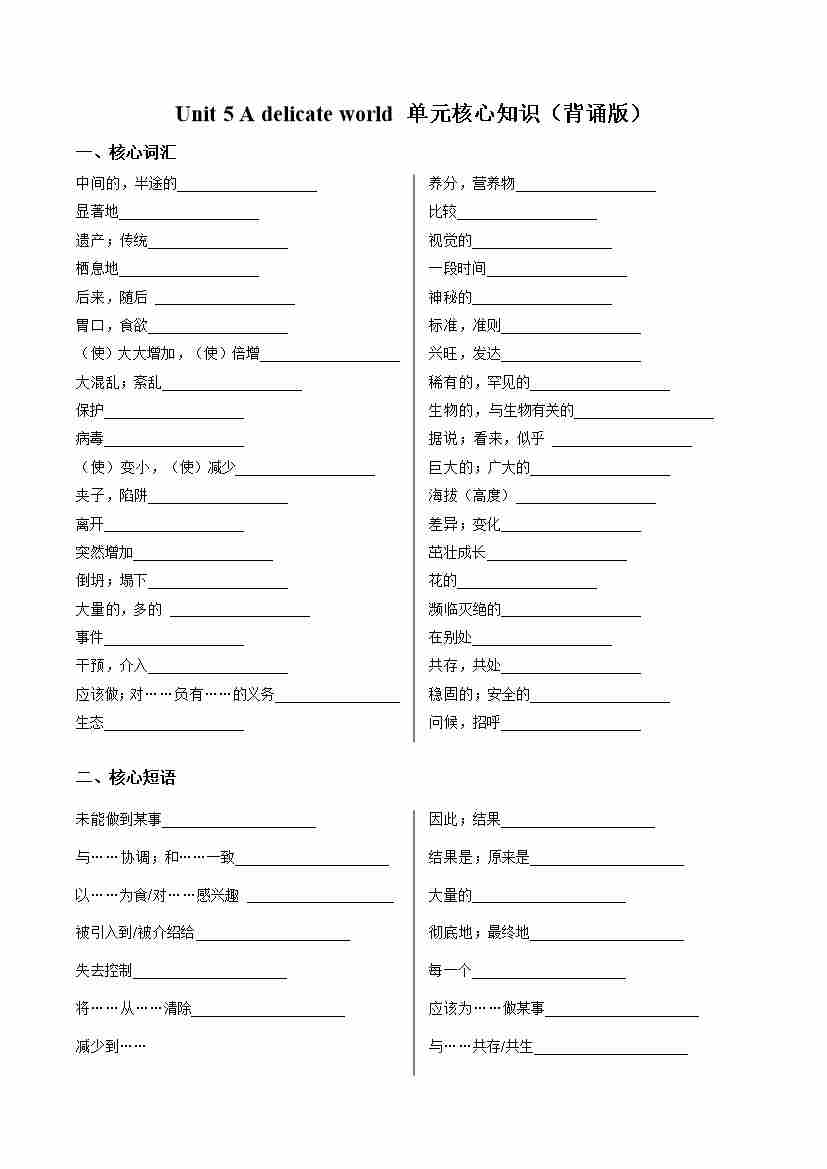 Unit 5 A delicate world(单元核心知识)(默写版)
