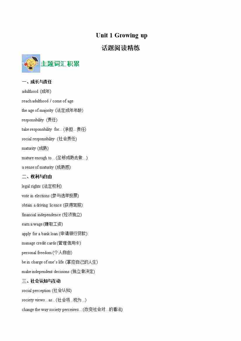 Unit 1 Growing up(话题阅读精练)(教师版)