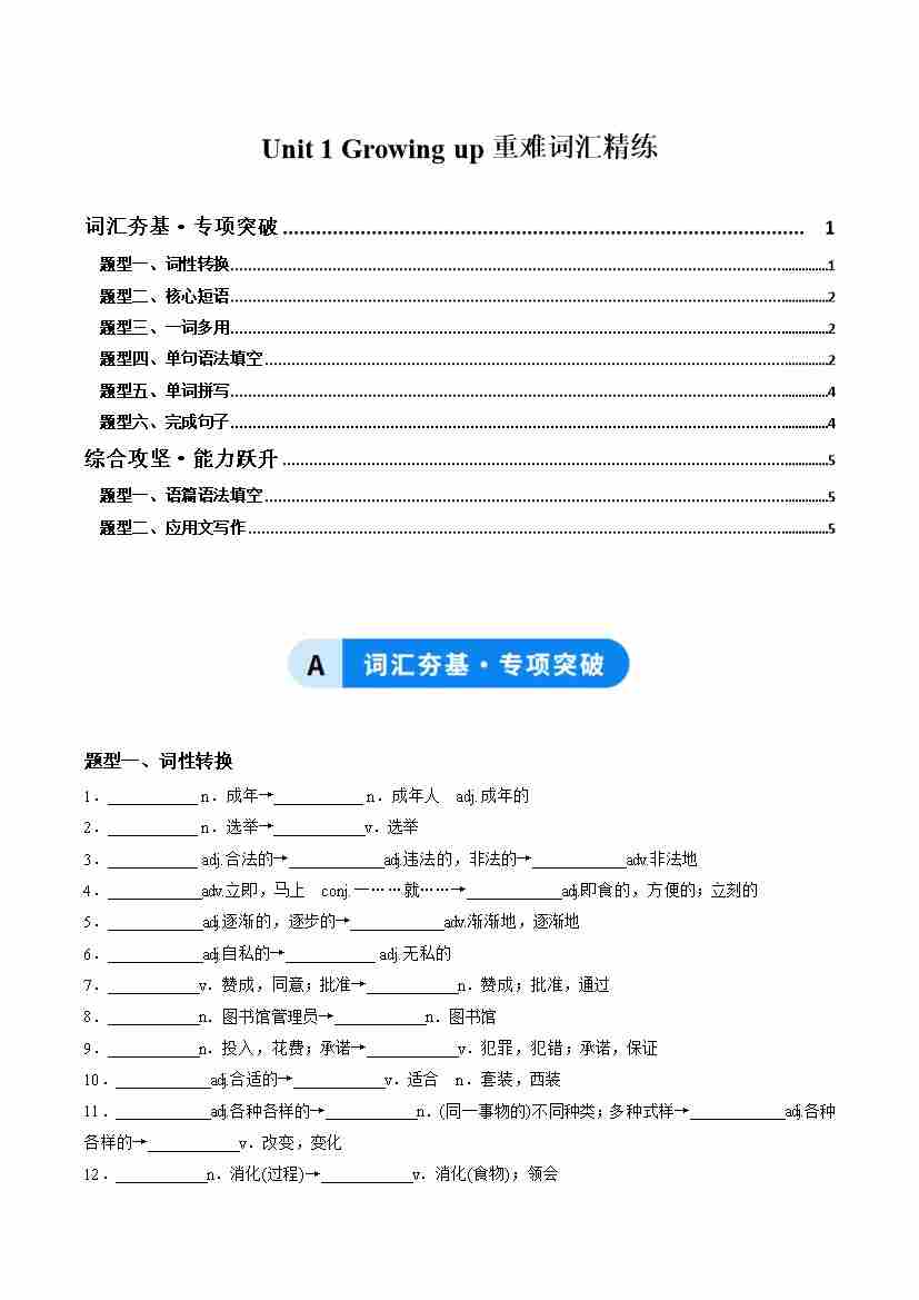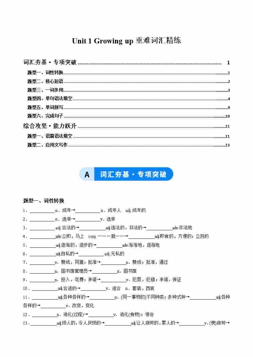 Unit 1 Growing up(重难词汇精练)(学生版)
