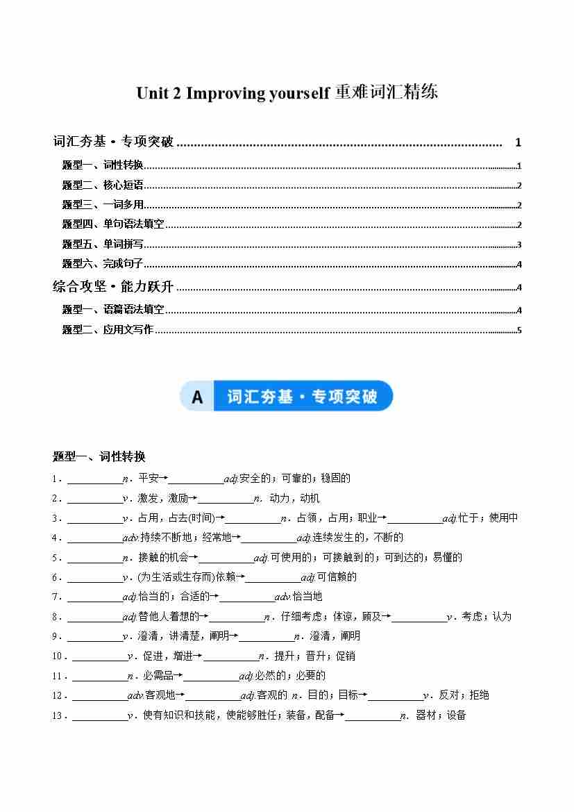 Unit 2 Improving yourself(重难词汇精练)(教师版)