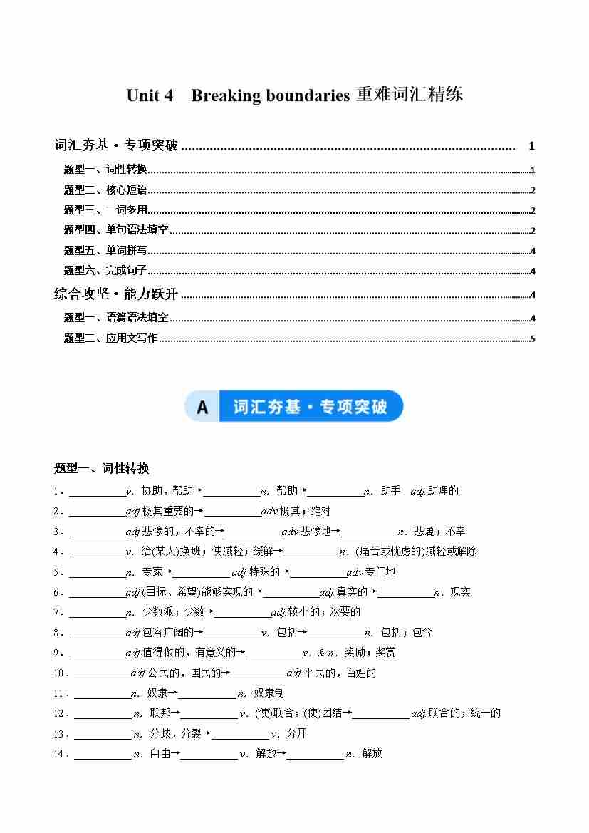 Unit 4 Breaking boundaries(重难词汇精练)(教师版)