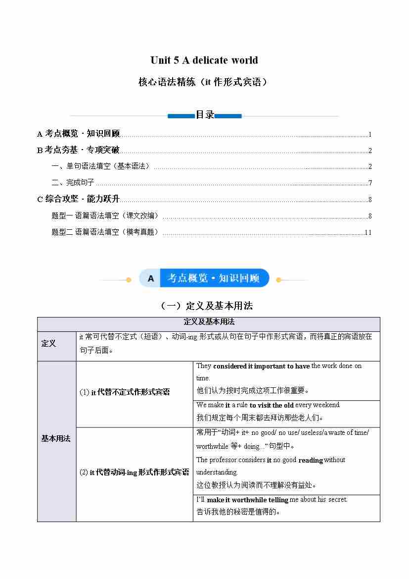 Unit 5 A delicate world it作形式宾语(单元核心语法精练)(学生版)