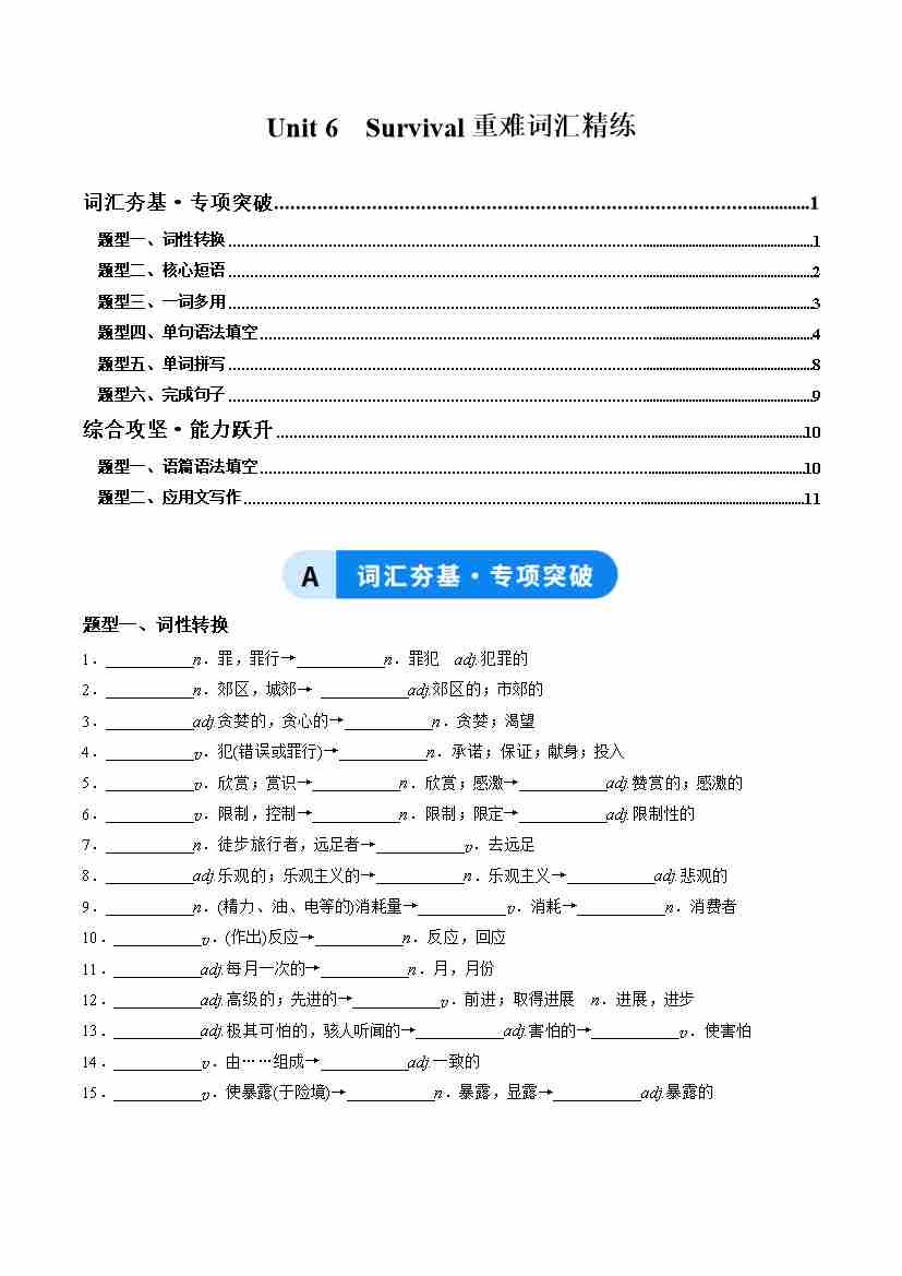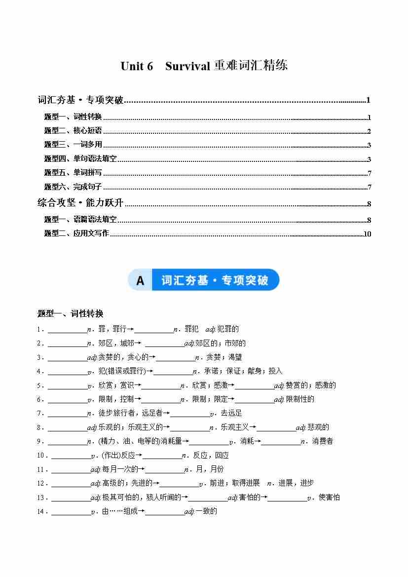 Unit 6 Survival(重难词汇精练)(解析版)