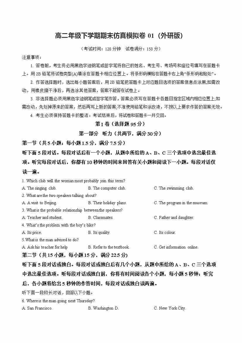 高二期末仿真模拟卷01(含听力、答题卡(学生版)