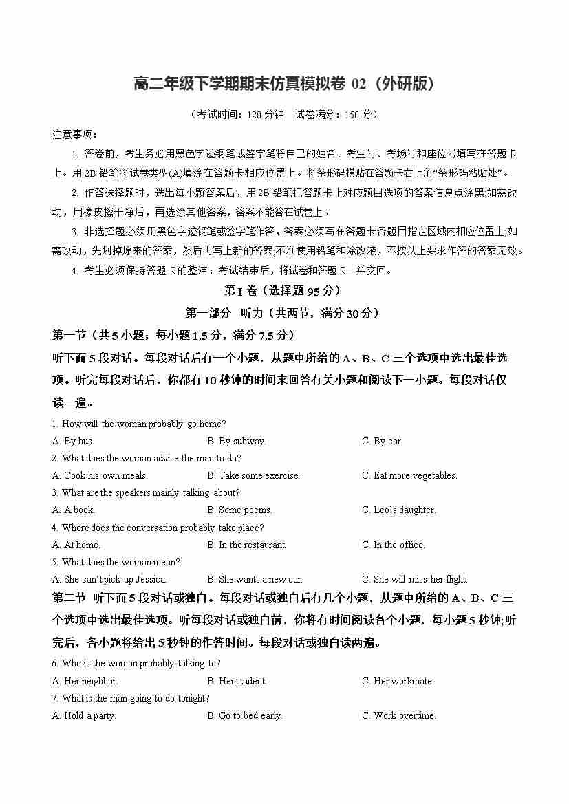 高二期末仿真模拟卷02(含听力、答题卡)(学生版)