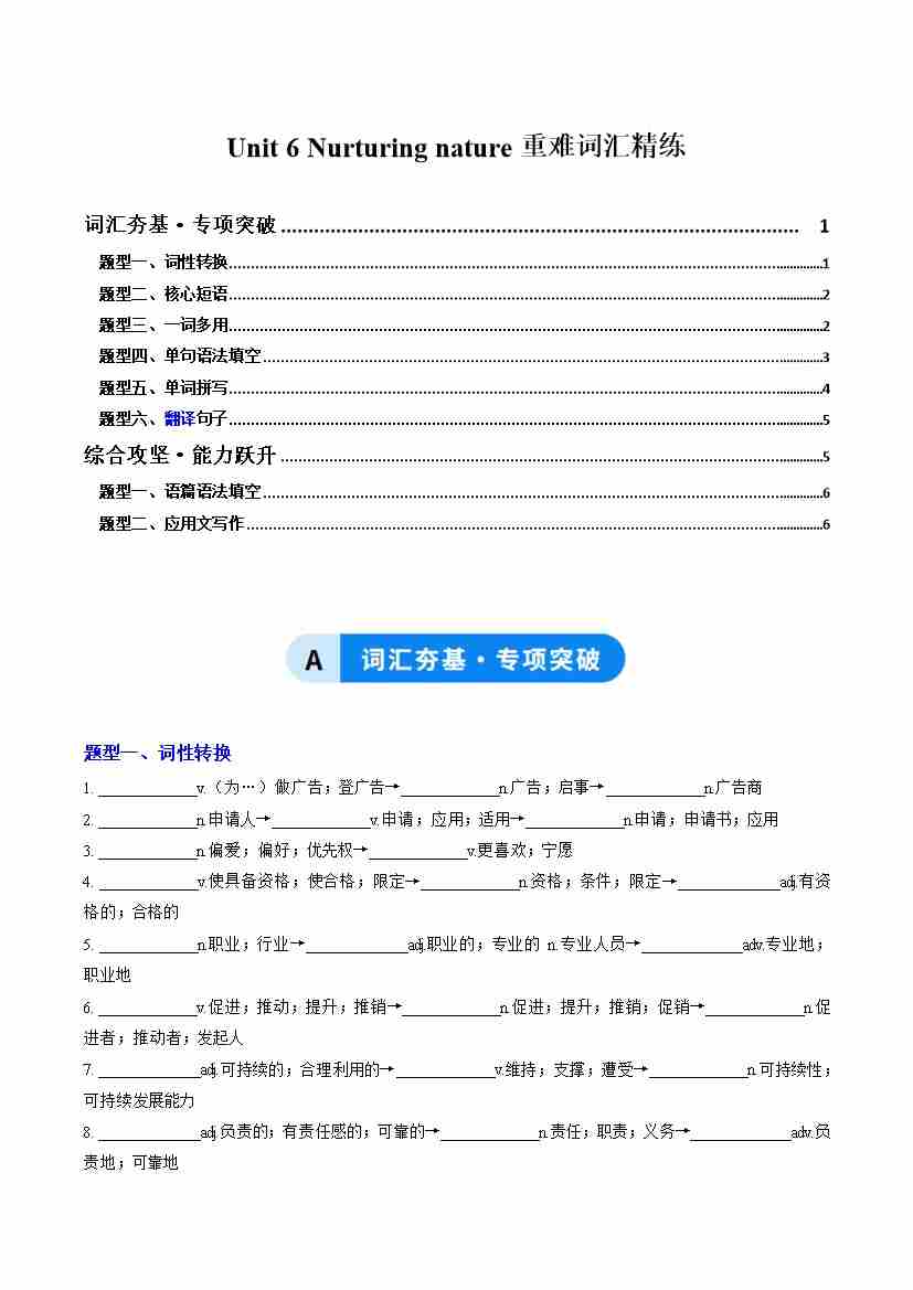 Unit 6 Nurturing nature(重难词汇精练)(教师版)