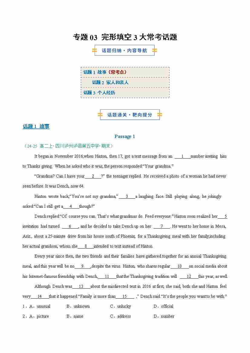 考前押题03 完形填空3大常考话题(各地名校最新好题)(期末复习专项训练)(学生版)
