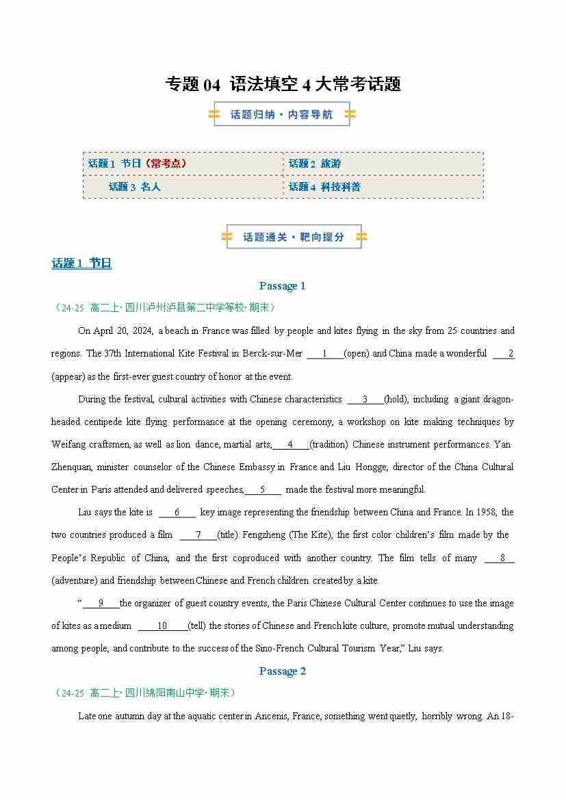 考前押题04 语法填空4大常考话题(各地名校最新好题)(期末复习专项训练)(学生版)