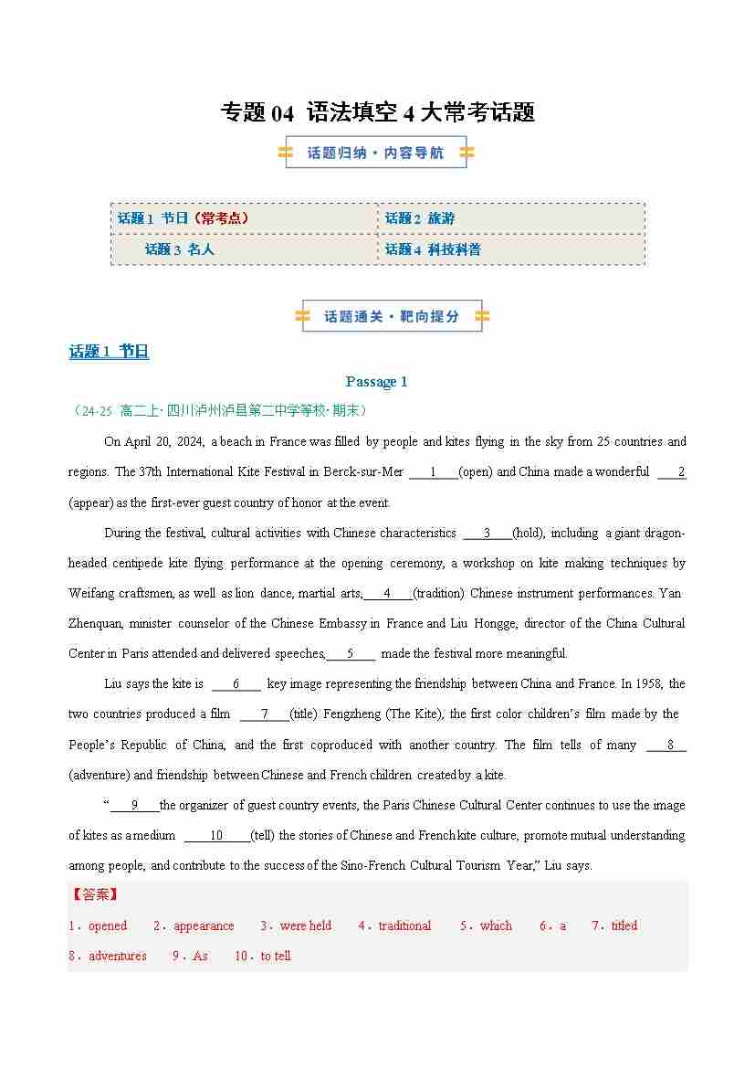 考前押题04 语法填空4大常考话题(各地名校最新好题)(期末复习专项训练)(教师版)