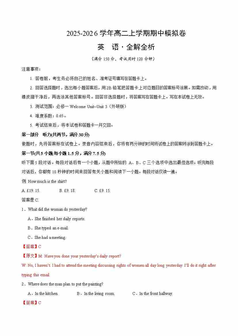 高二英语上学期期中模拟卷(外研版)(听力音频)