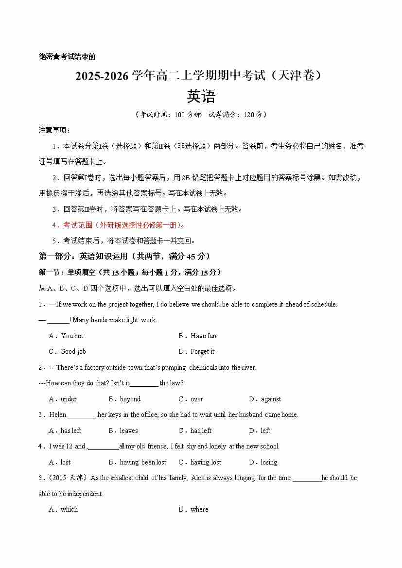 高二英语上学期期中模拟卷(天津专用)(测试范围:外研版选择性必修第一册)(学生版)