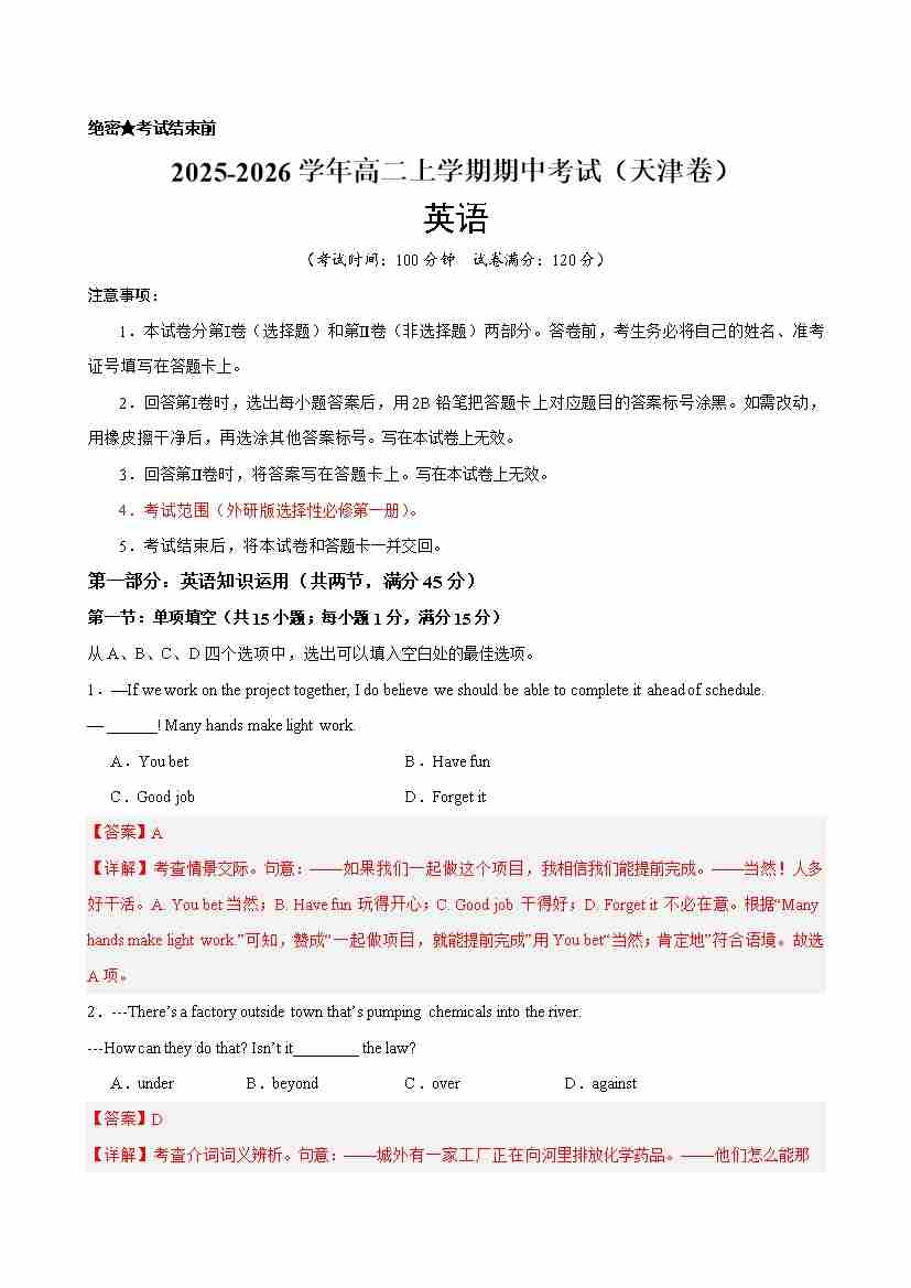 高二英语上学期期中模拟卷(天津专用)(测试范围:外研版选择性必修第一册)(教师版)