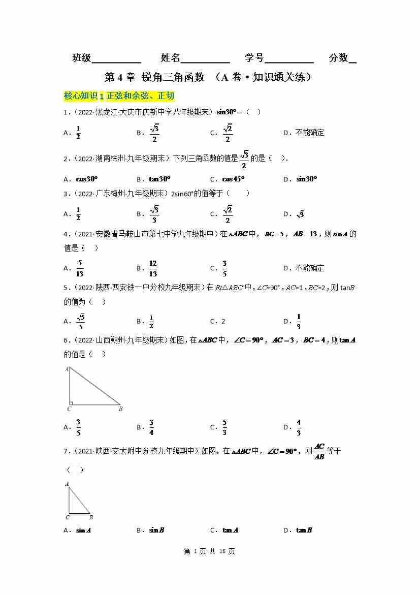 第4章 锐角三角函数(A卷·知识通关练)(原卷版)