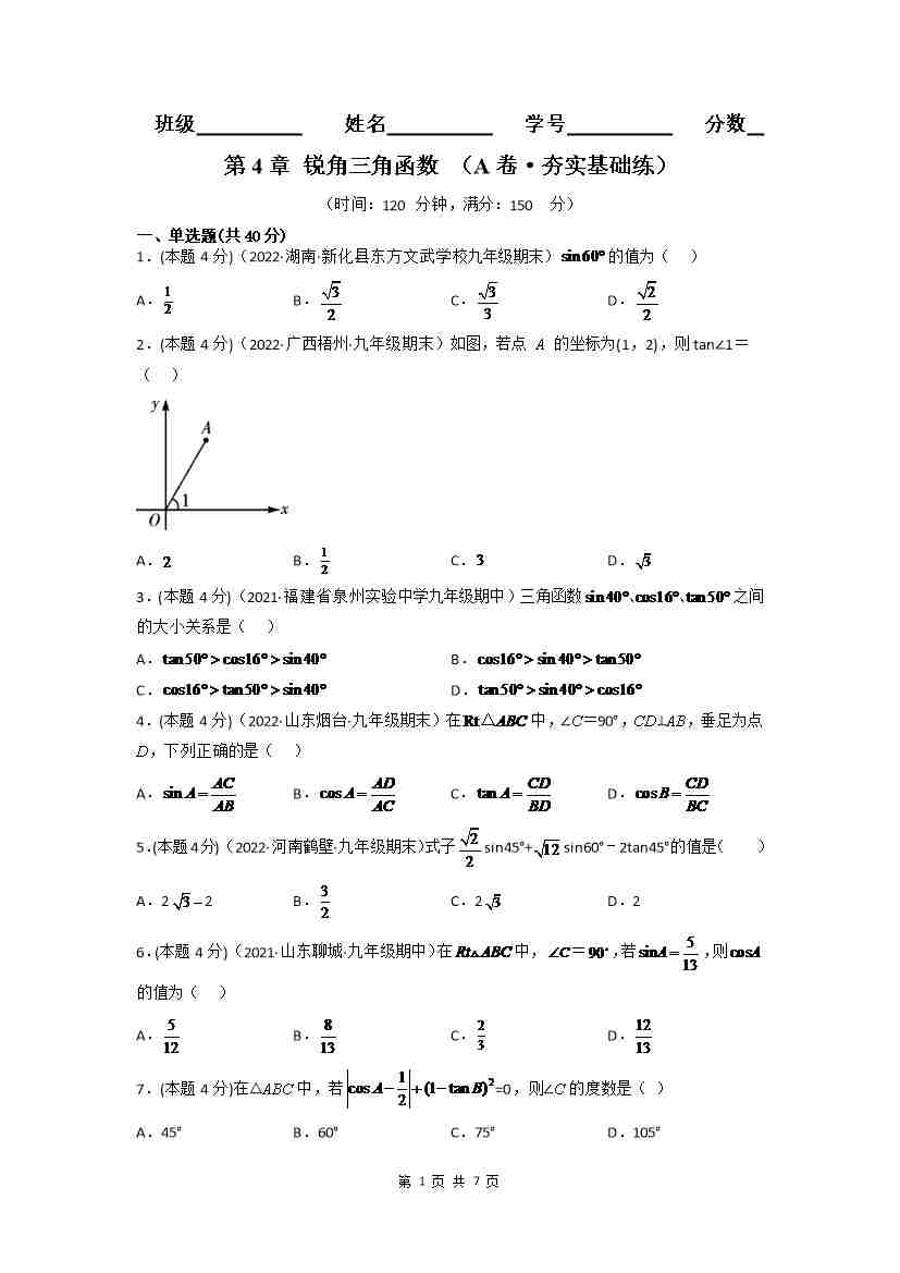 第4章 锐角三角函数(A卷·夯实基础练)(原卷版)