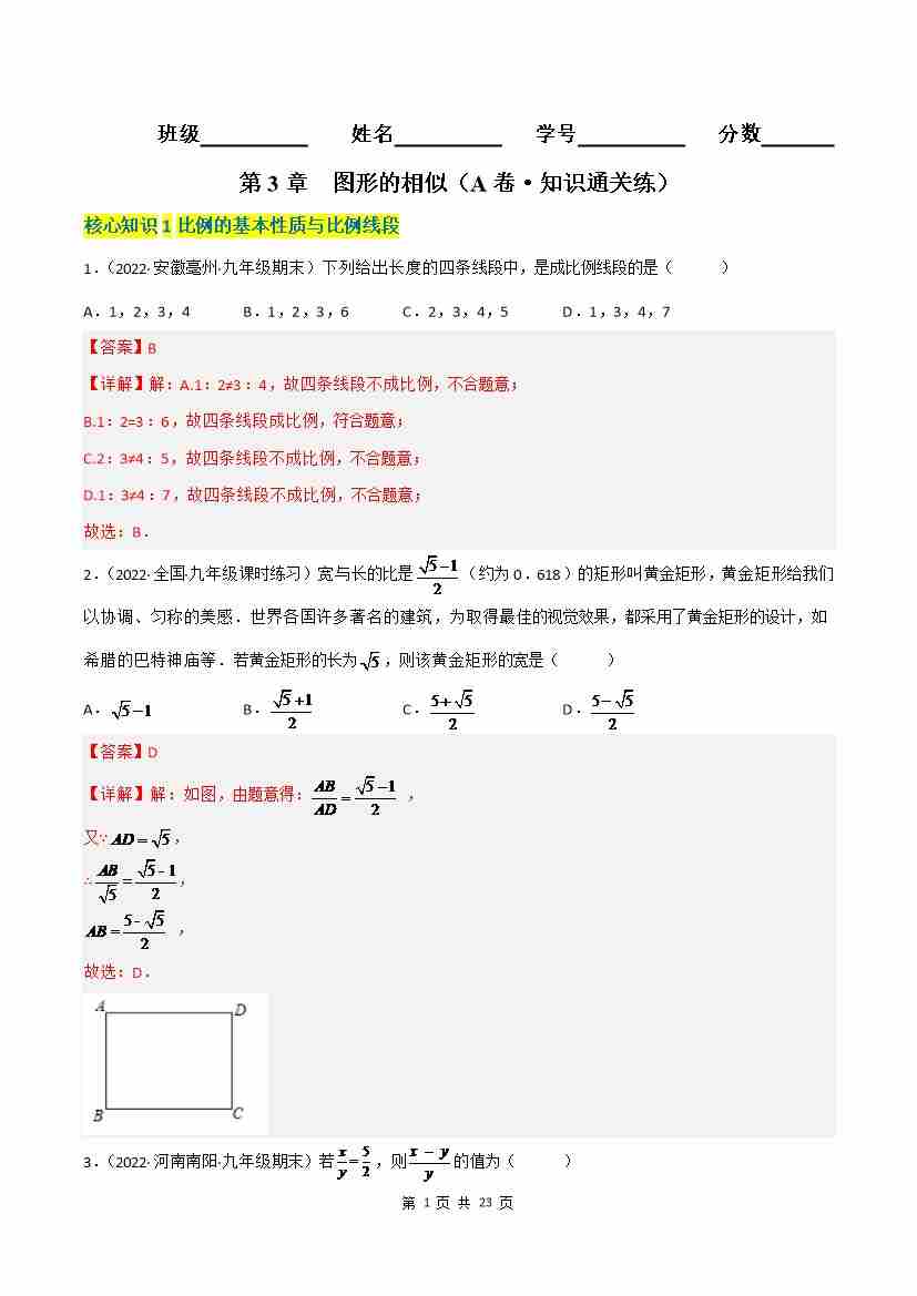 第3章 图形的相似(A卷·知识通关练)(解析版)