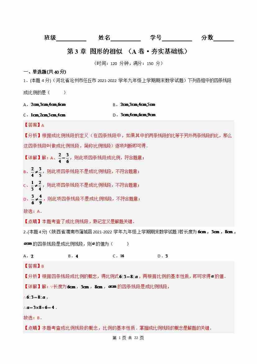 第3章 图形的相似(A卷·夯实基础练)(解析版)