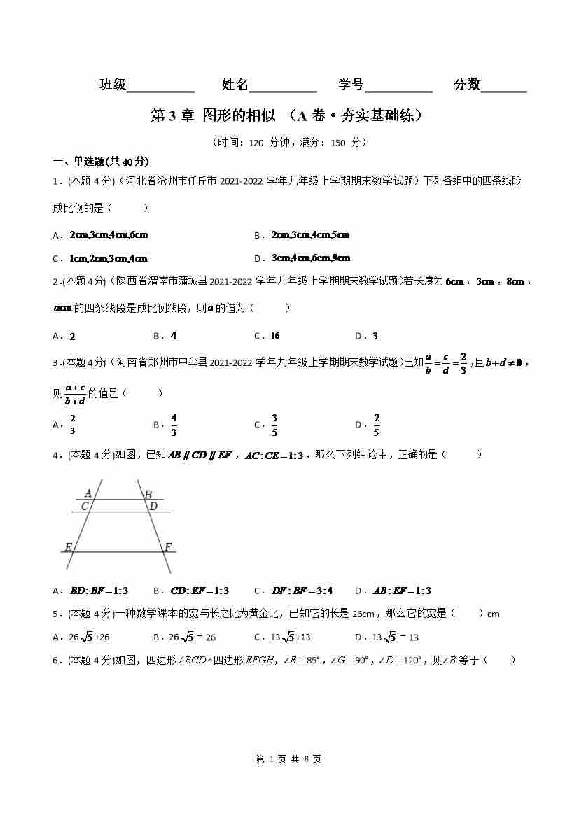 首页 > 全部 > 单元AB卷 > 第3章 图形的相似(A卷·夯实基础练)(原卷版)