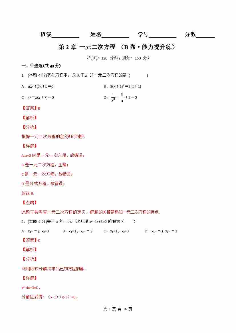 第2章 一元二次方程(B卷·能力提升练)(解析版)