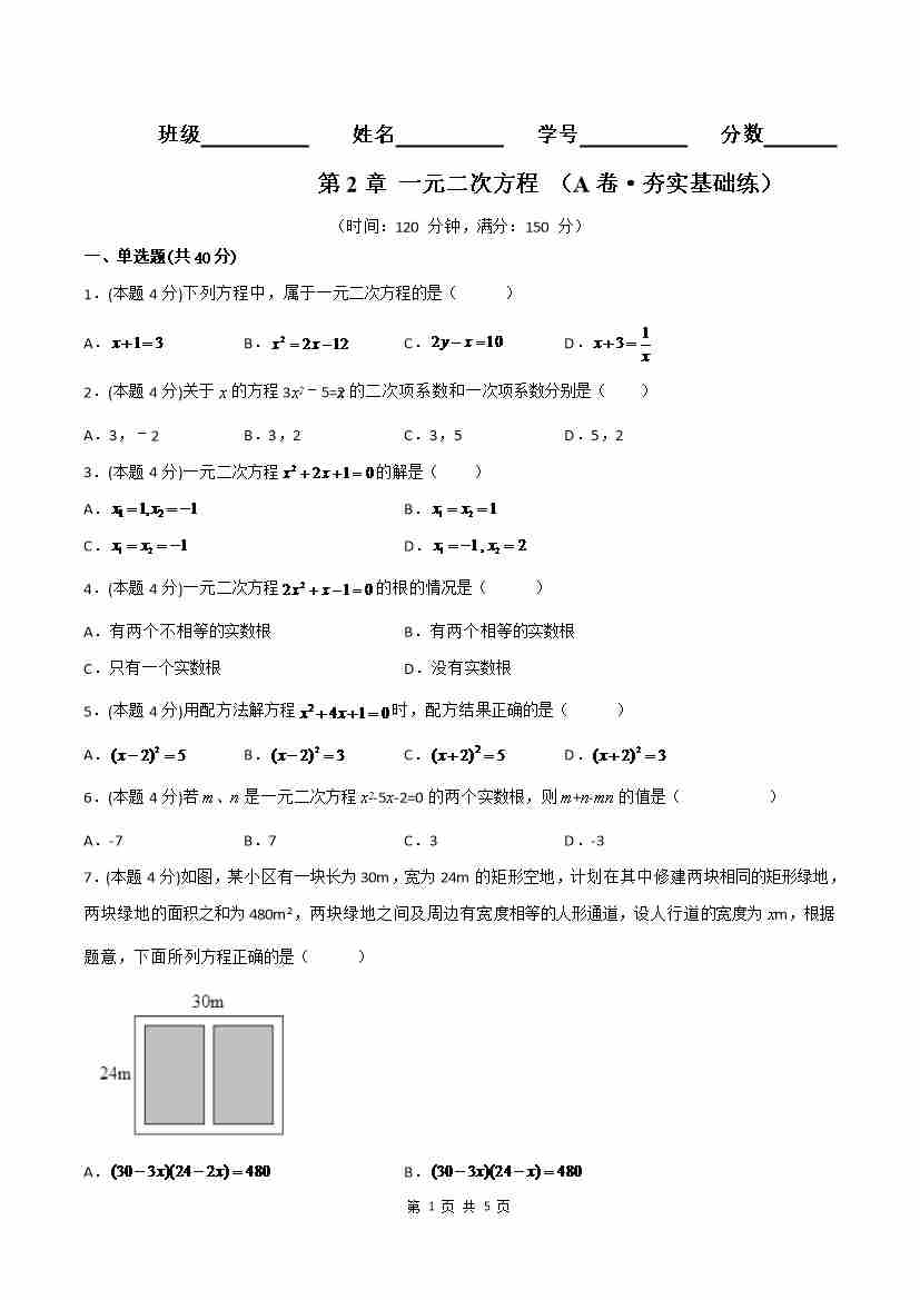 第2章 一元二次方程(A卷·夯实基础练)(原卷版)
