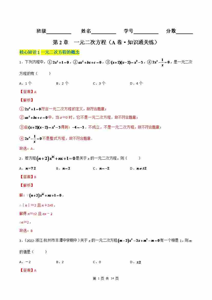 第2章 一元二次方程(A卷·知识通关练) (解析版)