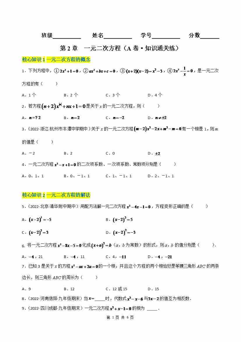 第2章 一元二次方程(A卷·知识通关练) (原卷版)