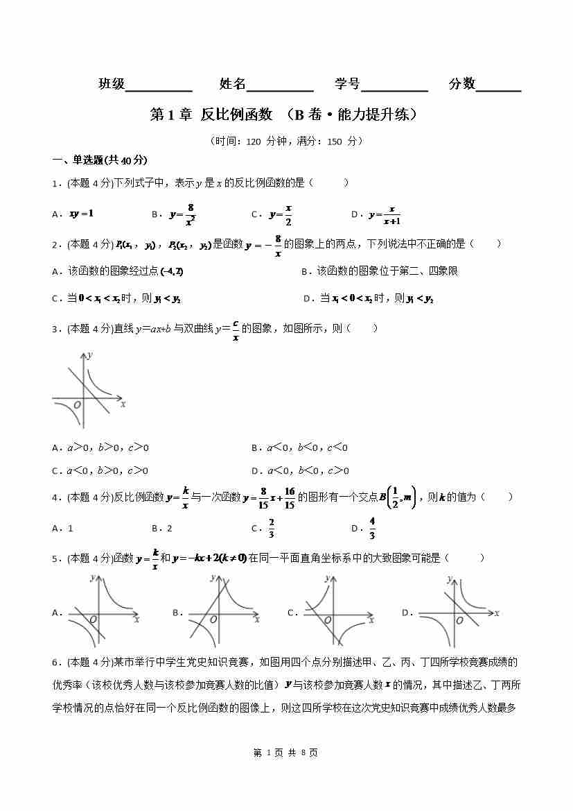 第1章 反比例函数(B卷·能力提升练)(原卷版)