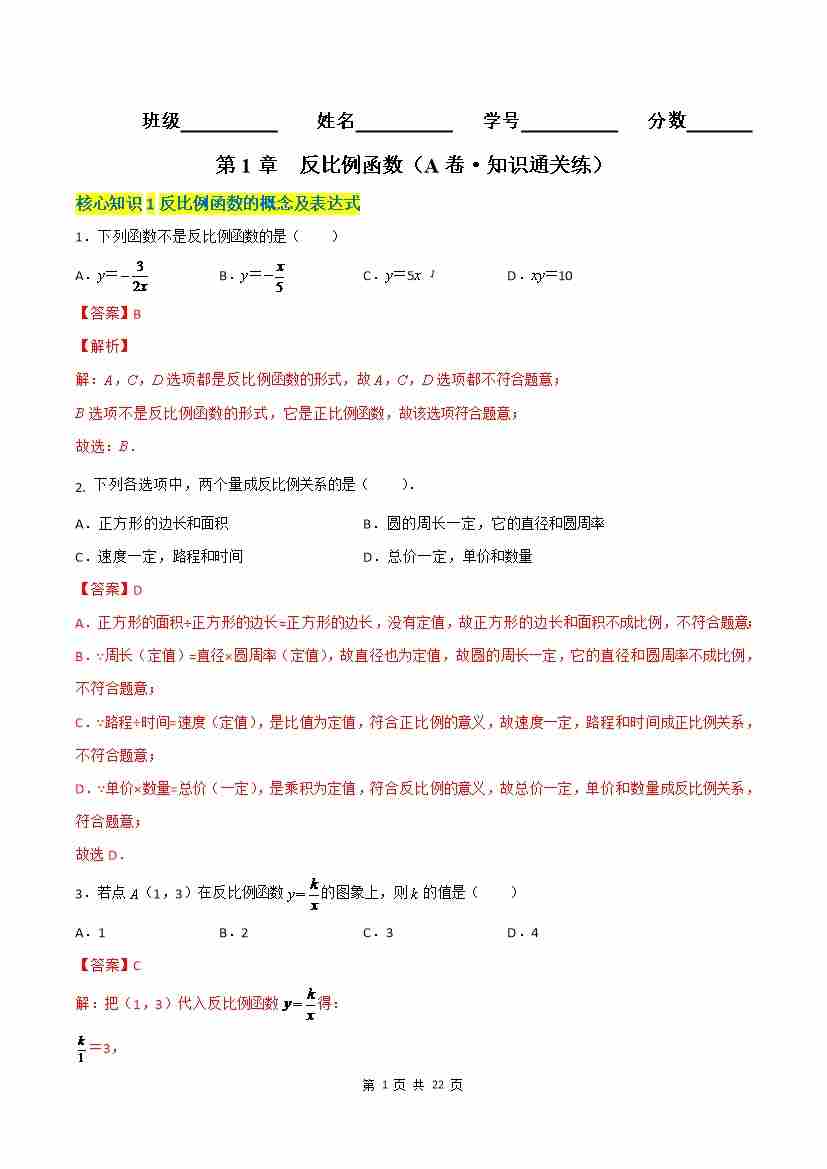 第1章 反比例函数(A卷·知识通关练)(解析版)