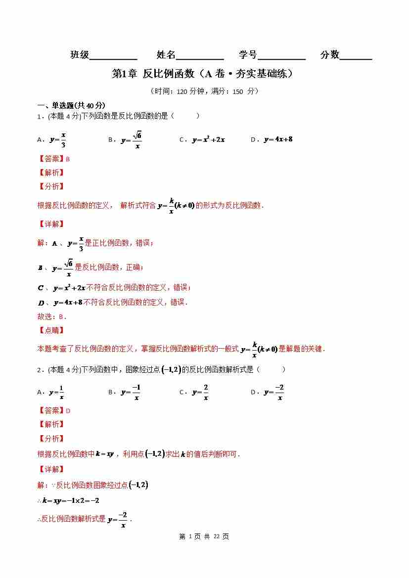 第1章 反比例函数(A卷·夯实基础练)(解析版)