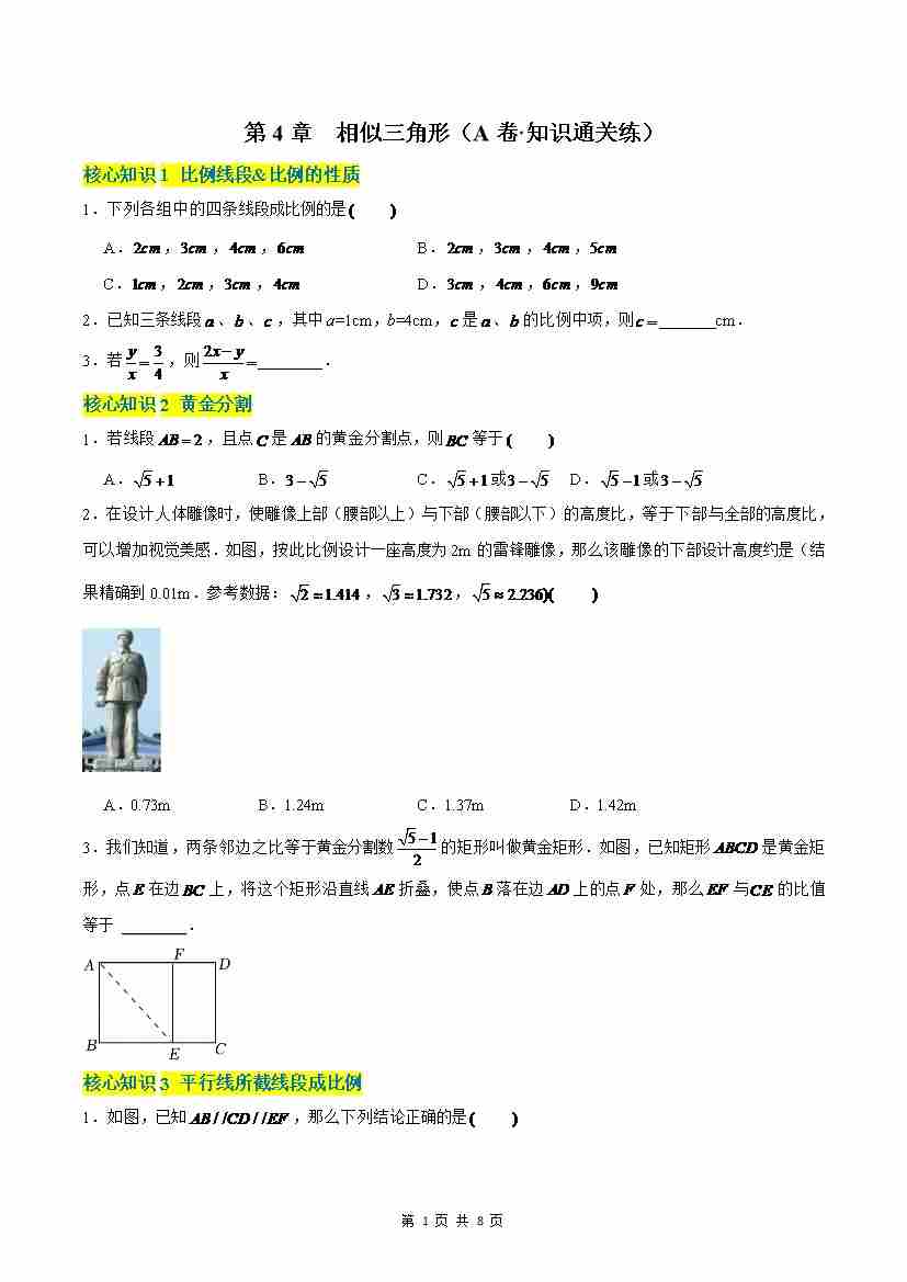 第4章 相似三角形(A卷·知识通关练)(原卷版)