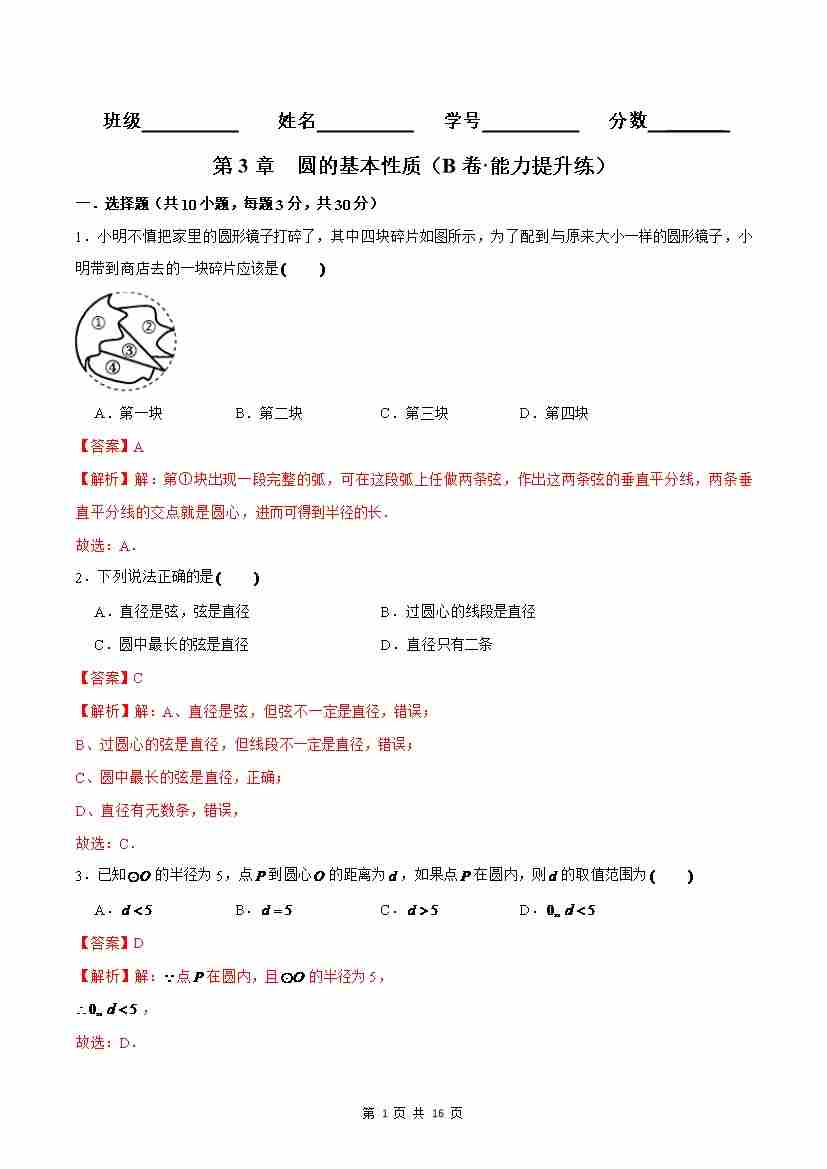 第3章 圆的基本性质(B卷·能力提升练)(解析版)