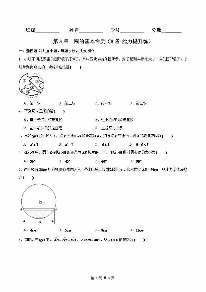 首页 > 全部 > 单元AB卷 > 第3章 圆的基本性质(B卷·能力提升练)(原卷版)