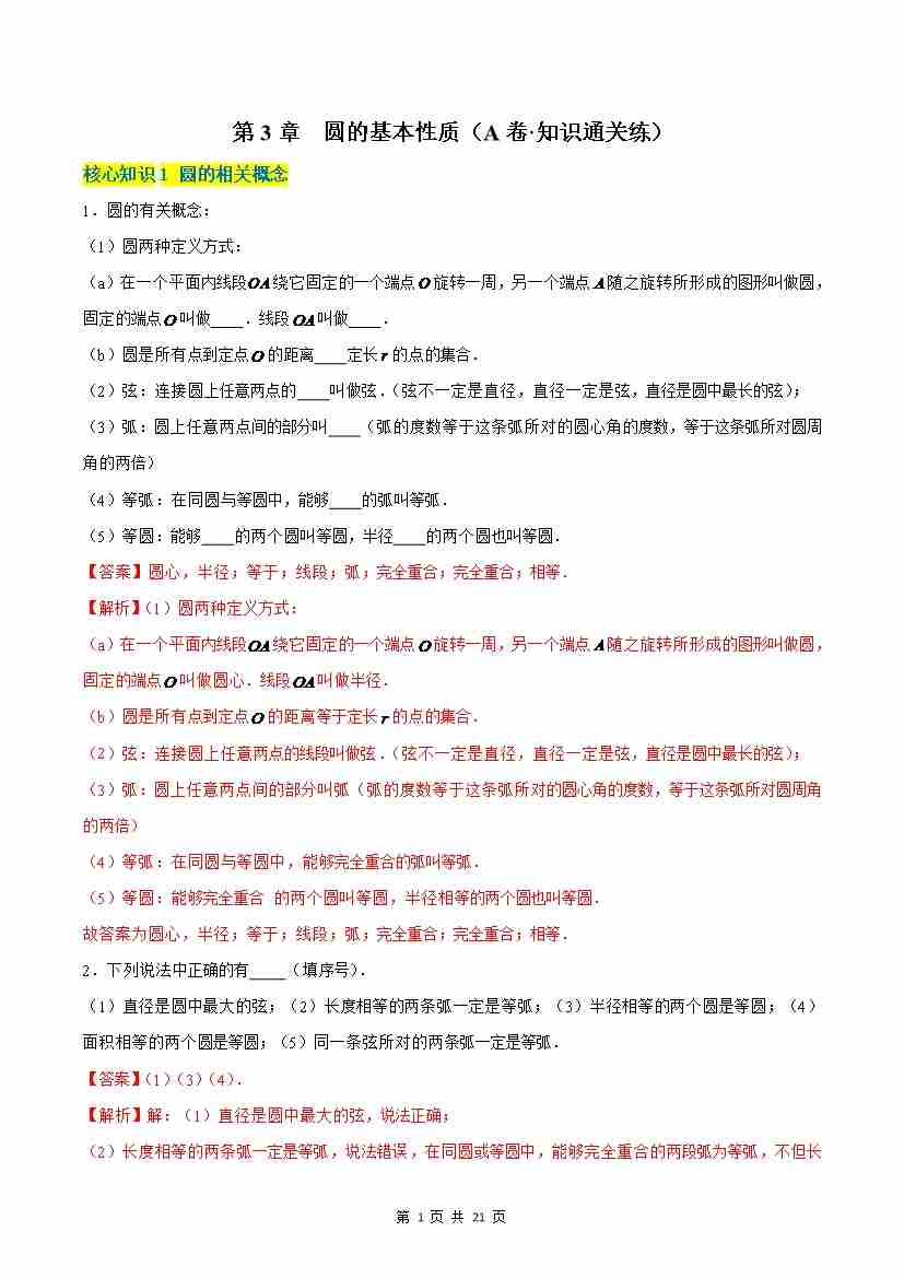 第3章 圆的基本性质(A卷·知识通关练)(解析版)