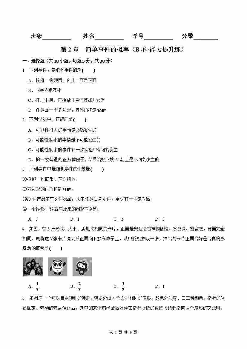 首页 > 全部 > 单元AB卷 > 第2章 简单事件的概率(B卷·能力提升练)(原卷版)