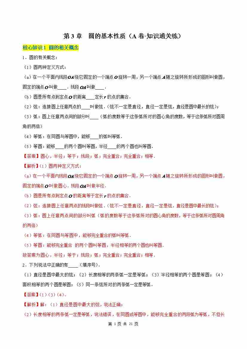第3章 圆的基本性质(A卷·知识通关练)(解析版)--