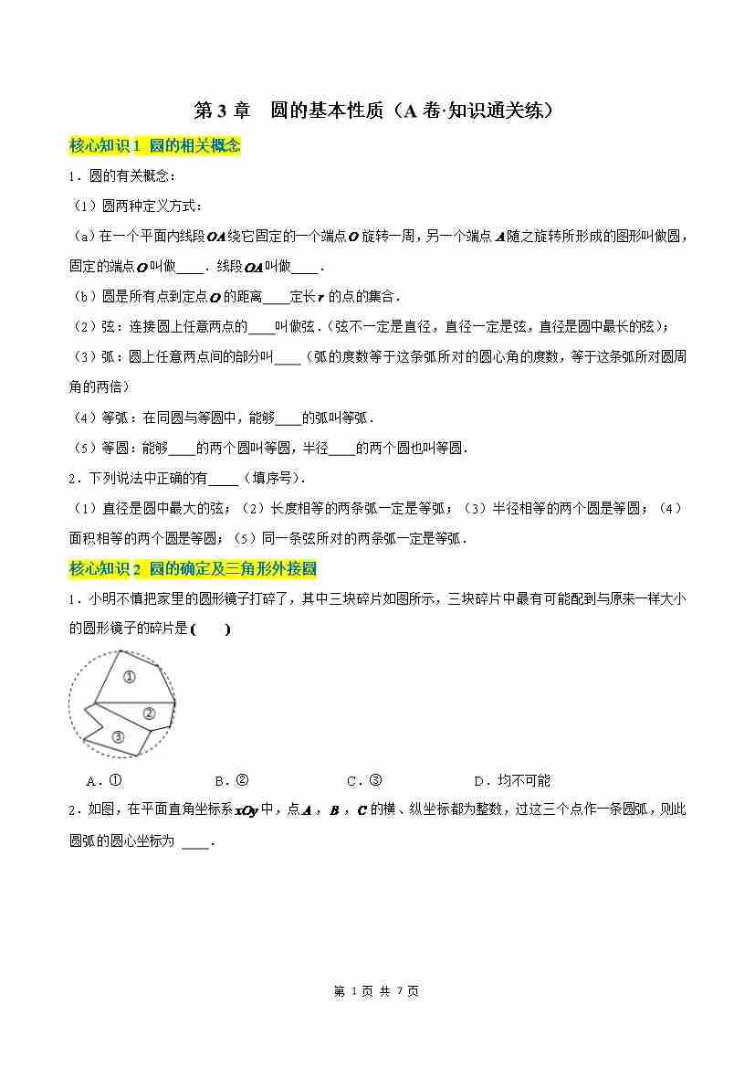 第3章 圆的基本性质(A卷·知识通关练)(原卷版)--