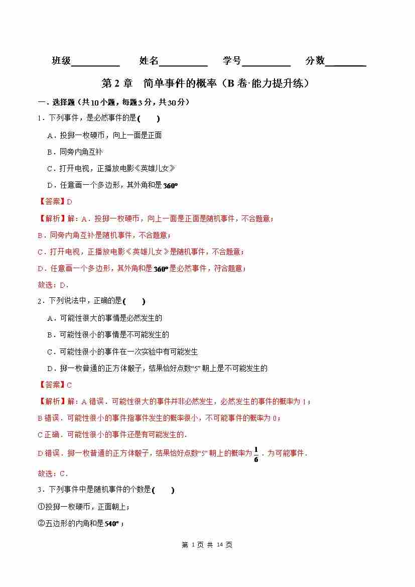 首页 > 全部 > 单元测试卷 > 第2章 简单事件的概率(B卷·能力提升练)(解析版)--
