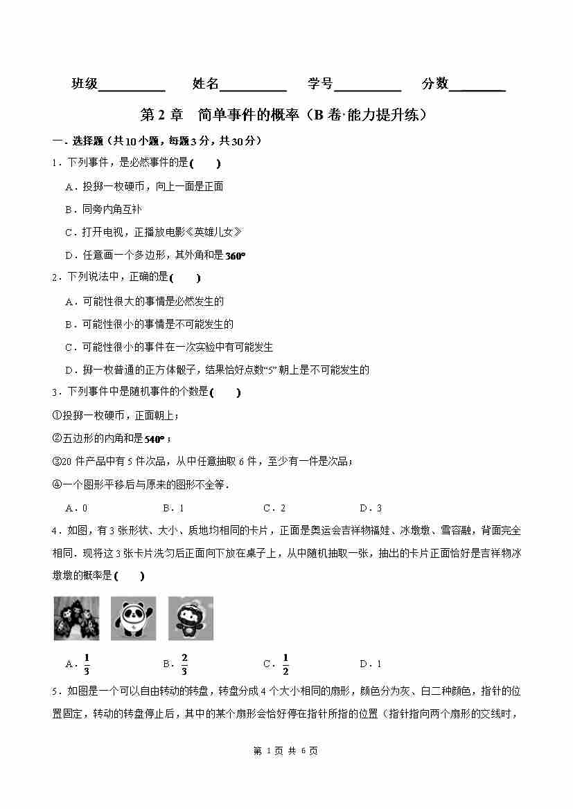 首页 > 全部 > 单元测试卷 > 第2章 简单事件的概率(B卷·能力提升练)(原卷版)--