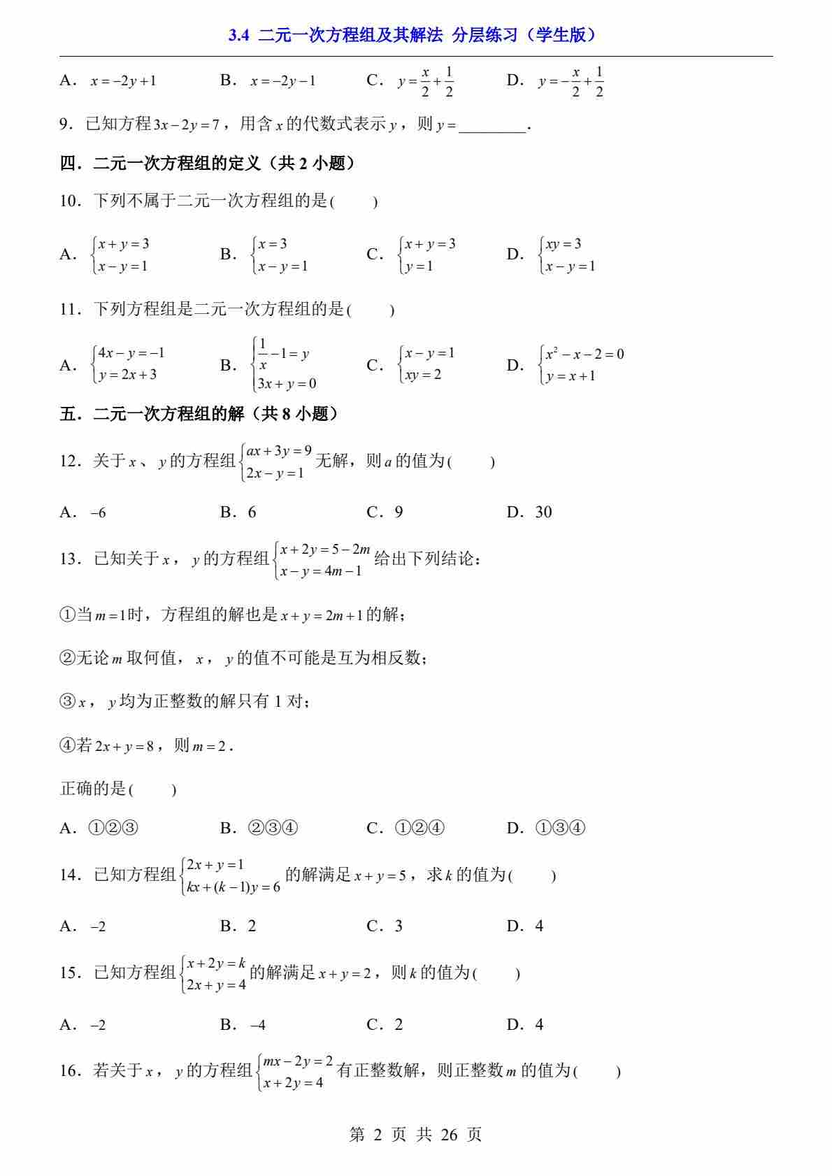 首页 > 全部 > 一课一练 > 3.4 二元一次方程组及其解法(分层练习)