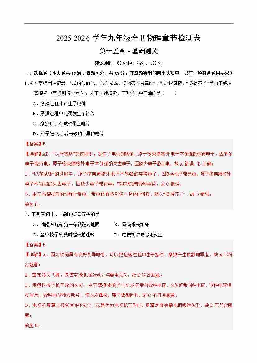首页 > 全部 > 单元基础卷 > 九年级物理第十五章单元测试·基础卷(解析版)