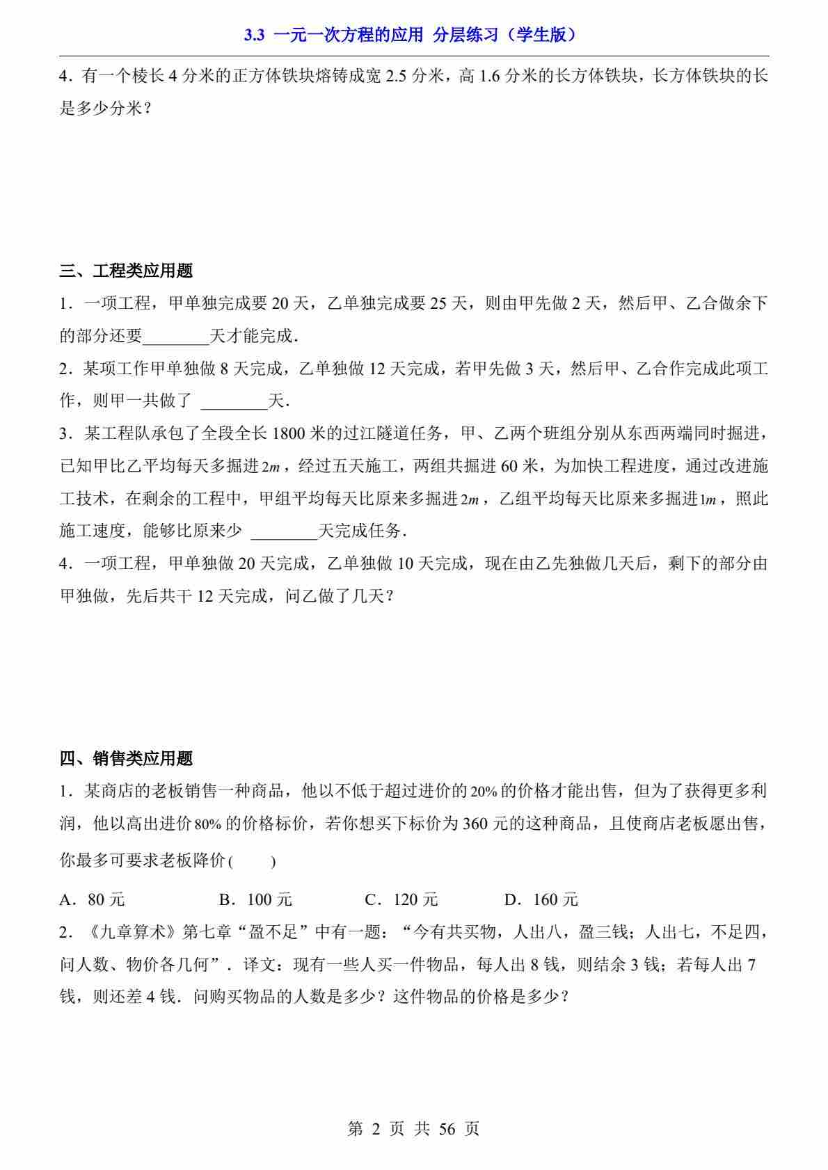 首页 > 全部 > 一课一练 > 3.3 一元一次方程的应用(分层练习)