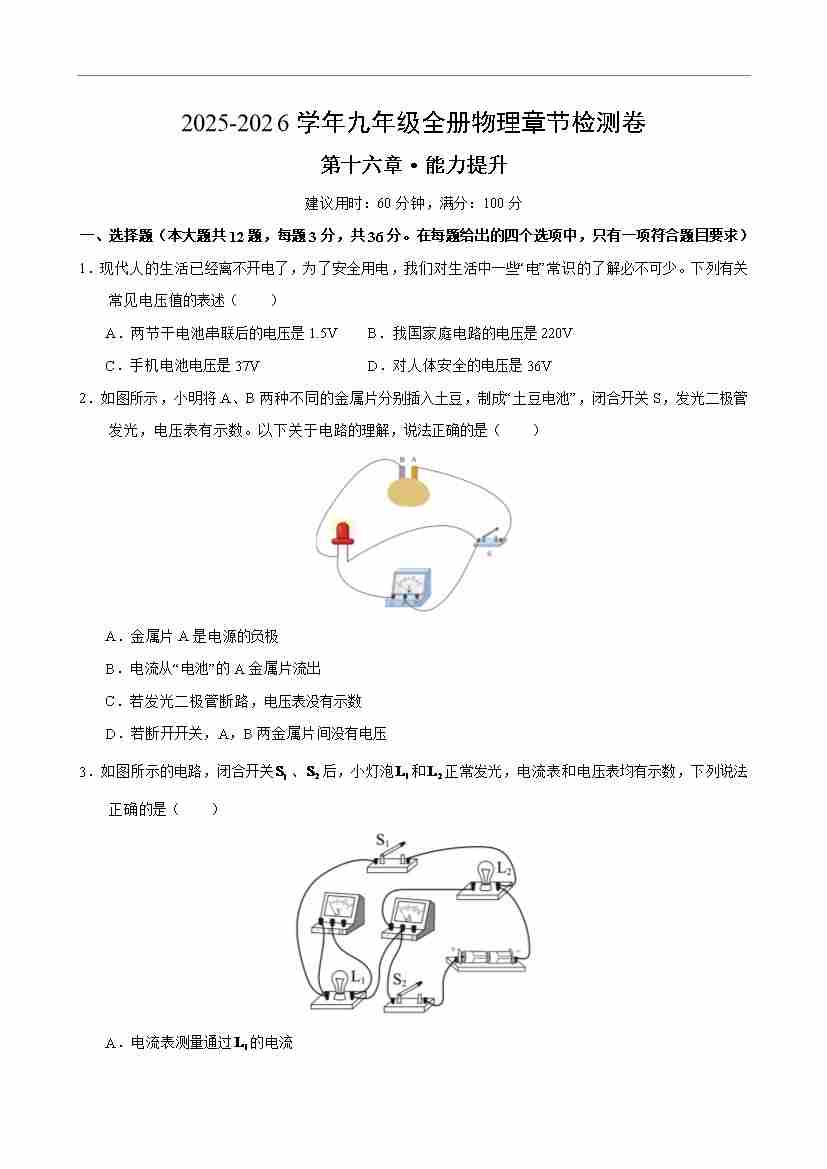 九年级物理第十六章单元测试·提升卷(考试版A4)