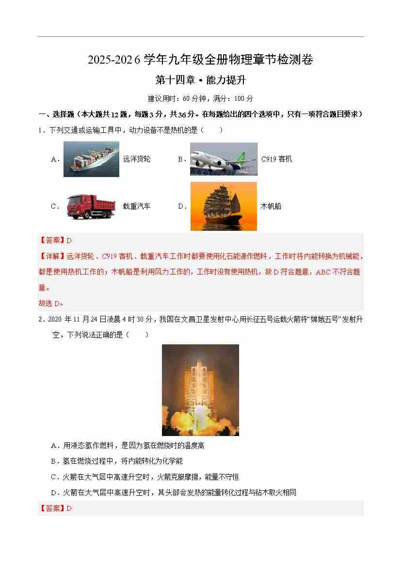 首页 > 全部 > 单元提升卷 > 九年级物理第十四章单元测试·提升卷(解析版)
