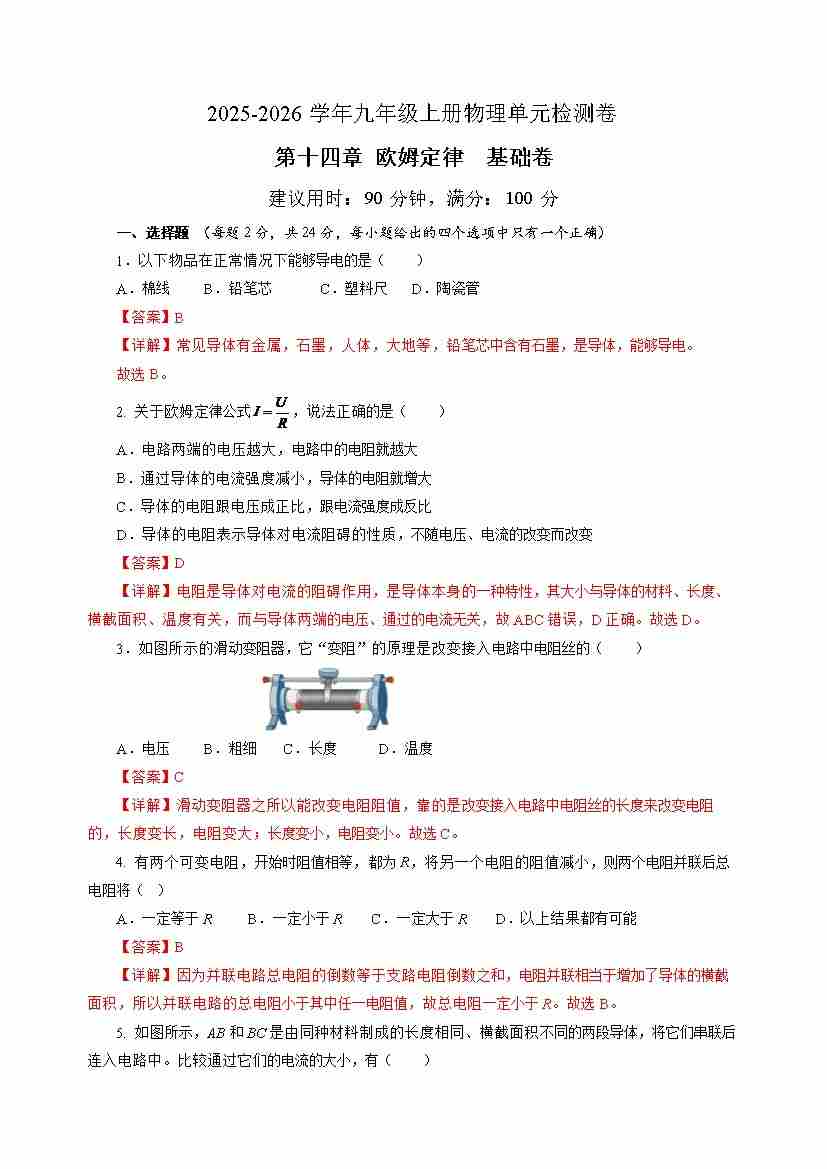 首页 > 全部 > 单元基础卷 > 第十四章 欧姆定律 单元测试·基础卷(解析版)