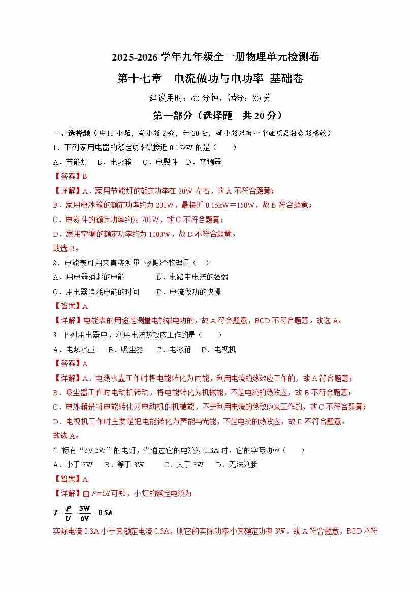 首页 > 全部 > 单元测试卷 > 第十七章 电流做功与电功率 单元测试·基础卷(解析版)