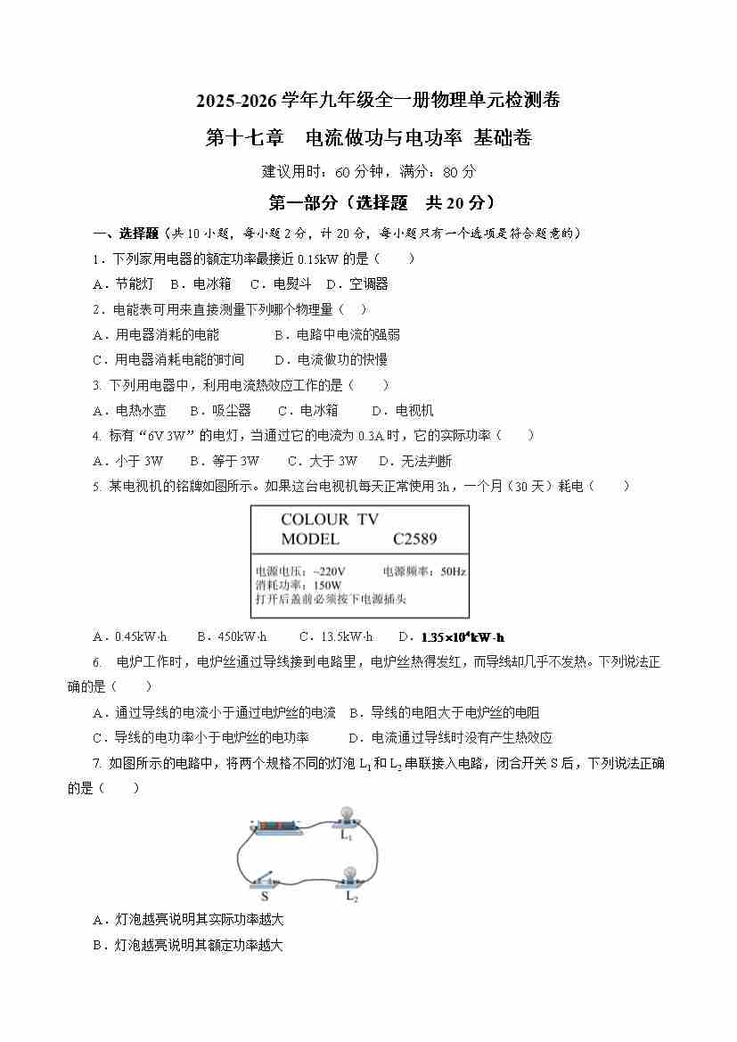 首页 > 全部 > 单元测试卷 > 第十七章 电流做功与电功率 单元测试·基础卷(考试版A4)