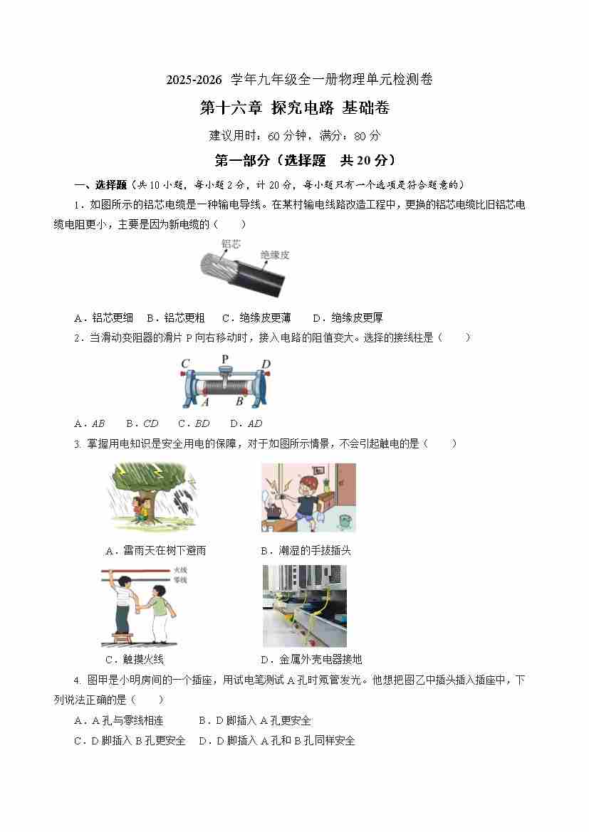 首页 > 全部 > 单元测试卷 > 第十六章 探究电路 单元测试·基础卷(考试版A4)