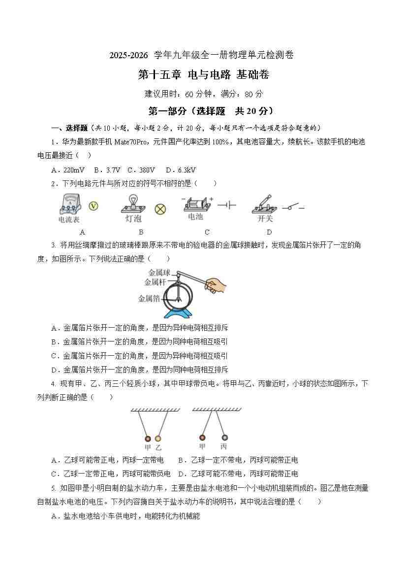 九全一册物理第十五单元 电与电路 单元测试·基础卷(考试版A4)