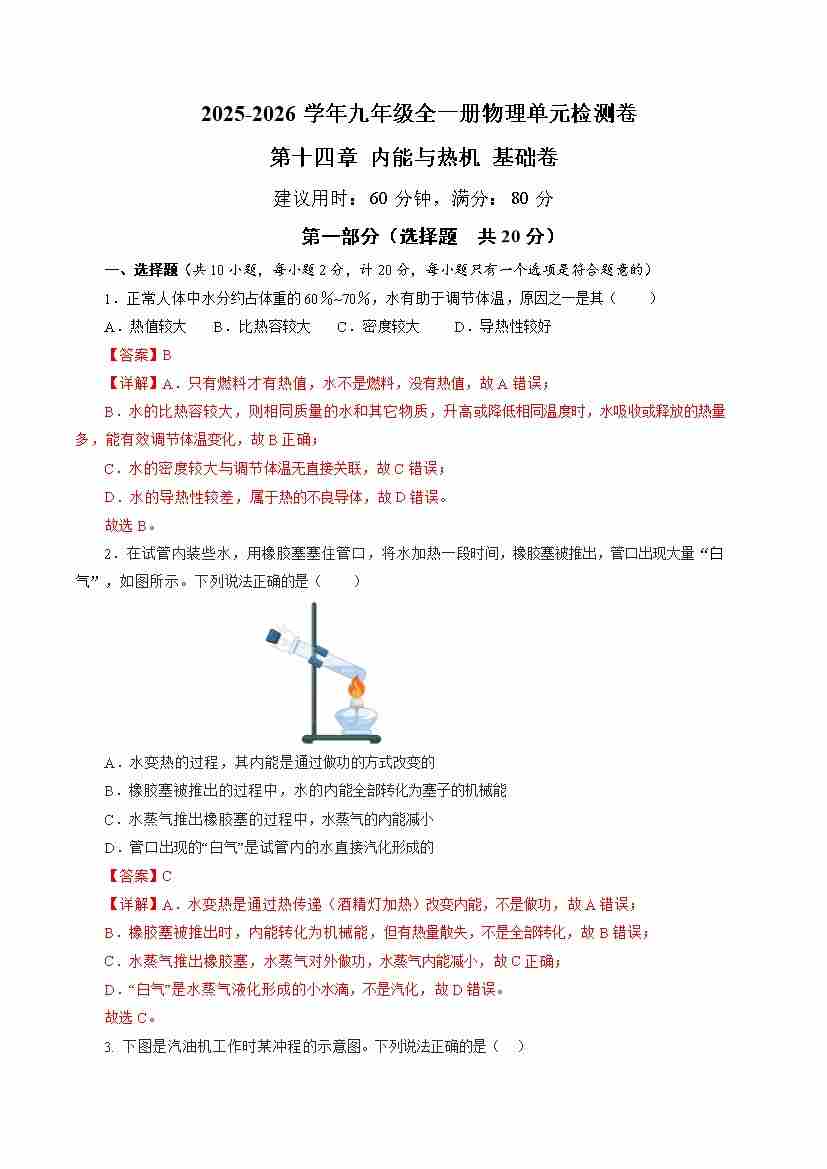 首页 > 全部 > 单元测试卷 > 九全一册物理第十四单元内能与热机 单元测试·基础卷(解析版)
