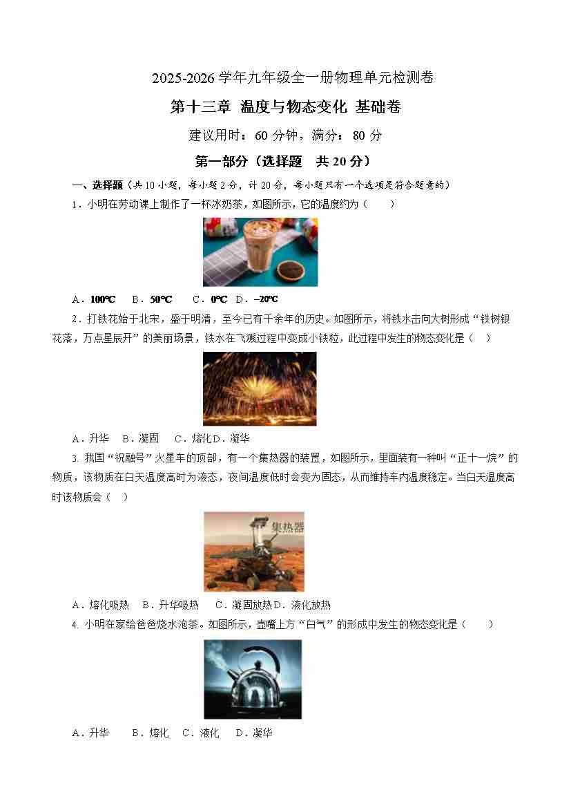 首页 > 全部 > 单元测试卷 > 九全一册物理第十三章 温度与物态变化 单元测试·基础卷(考试版A4)